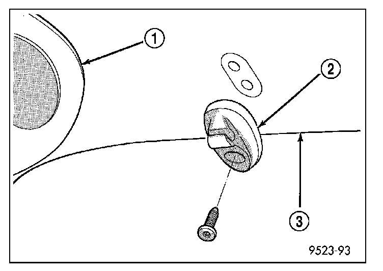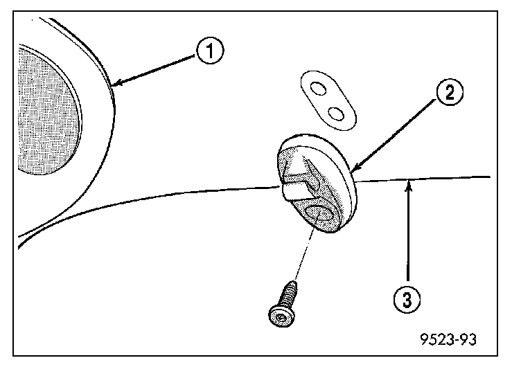 1. Position the sun visor support (2) on the headliner (3) and install the screw that secures the support to the roof panel. Tighten the screw to 2.2 N.m (20 in.lbs.).