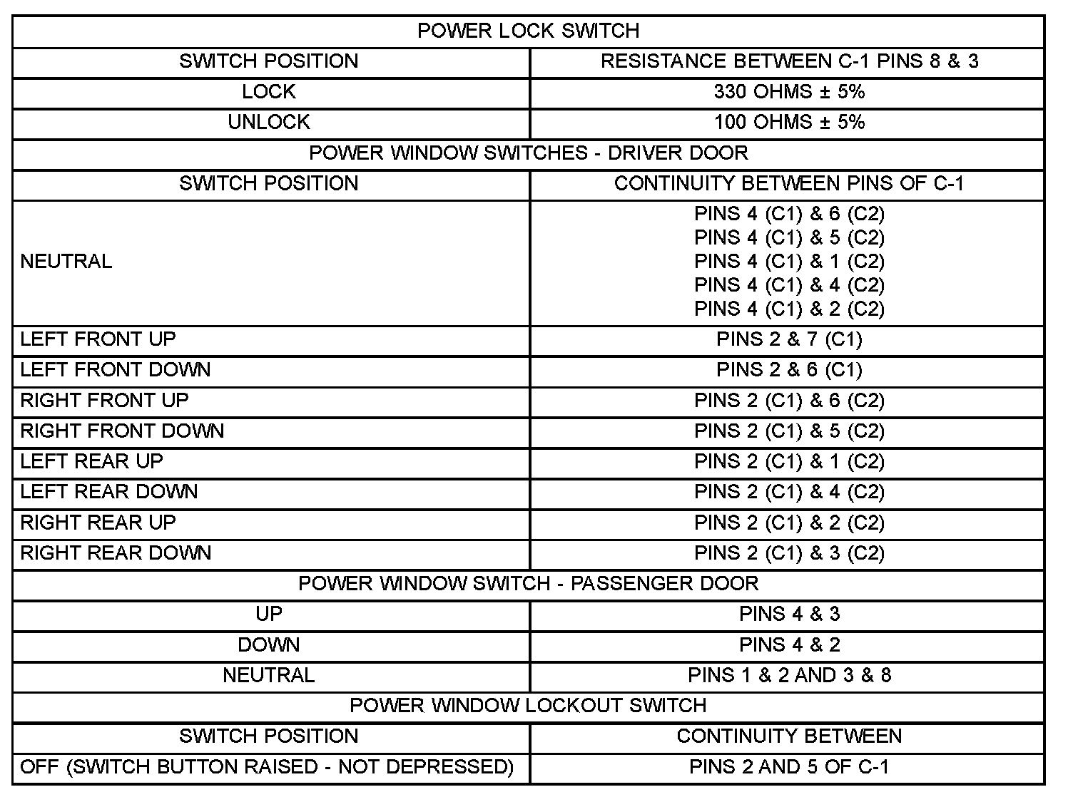 2. Test the switch continuity. See the Switch Tests chart to determine if the continuity is correct for the suspect switches in each switch position. If not OK, replace the faulty window/lock switch as required.