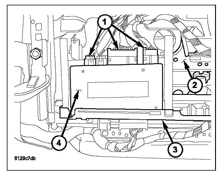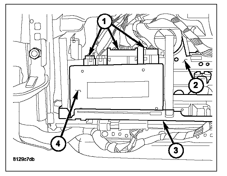 1. Place the module (4) into position making sure the mounting tabs are properly aligned with the front bracket.