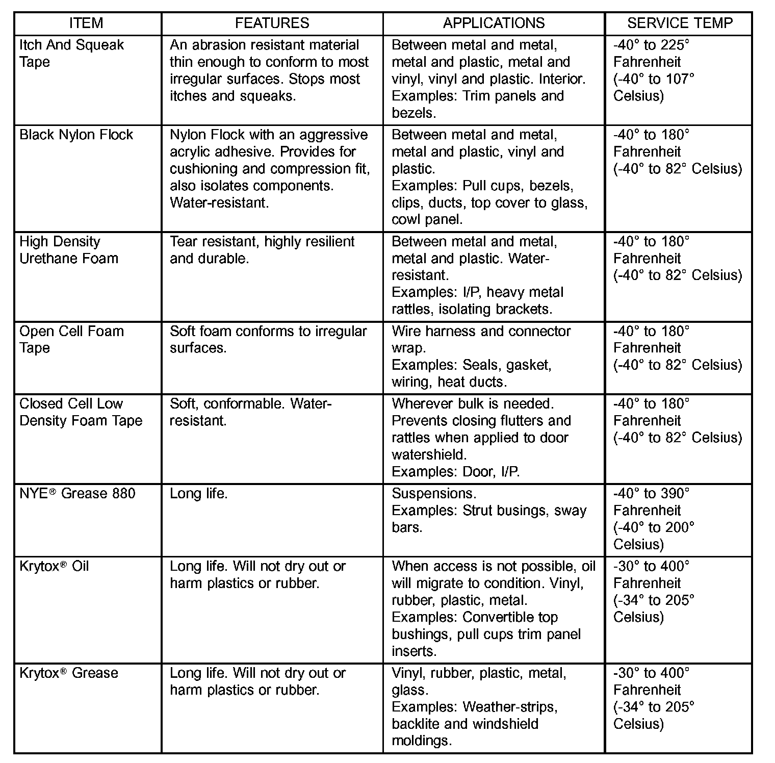 Many BSR complaints such as loose trim, can be serviced using the Mopar(R) parts BSR Noise Reduction Kit. This kit contains various tapes including foam, flock and anti-squeak used to eliminate noises caused by metal, plastic and vinyl components. Long life lubricants and greases can also be used on a variety of components. Refer to the Buzz, Squeak & Rattle Kit table for material contents and usage.
