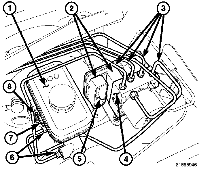 8. Remove the 4 chassis lines (3) at the HCU (4).