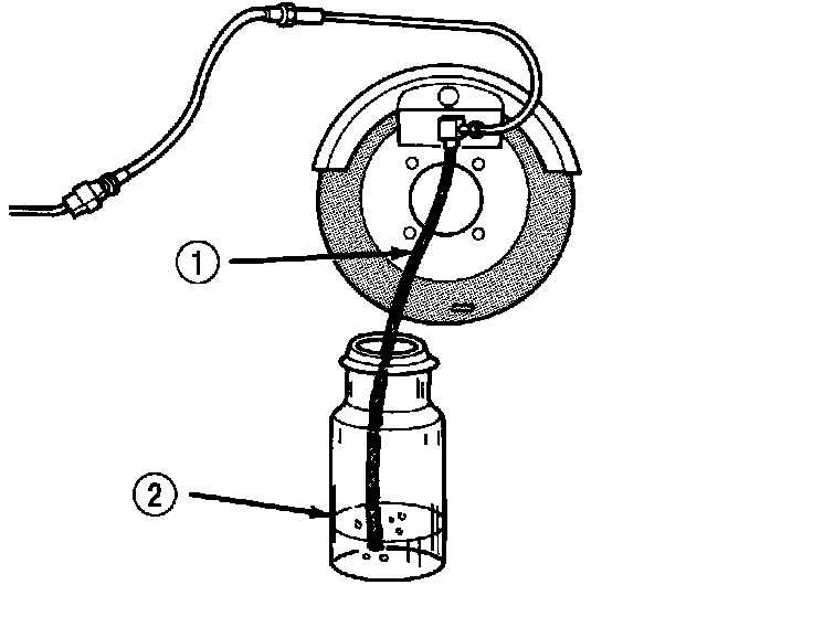 3. Attach one end of bleed hose to bleed screw and insert opposite end in glass container partially filled with brake fluid. Be sure end of bleed hose is immersed in fluid.