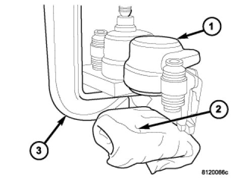 8. Remove piston dust boots (2) with a suitable pry tool.
