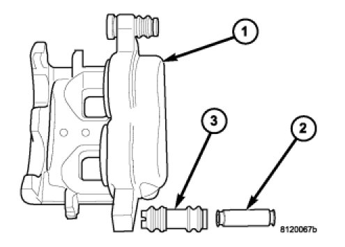 10. Push caliper mounting bolt bushings (3) out of the boot seals (2) and remove the boot seals from the caliper (1).