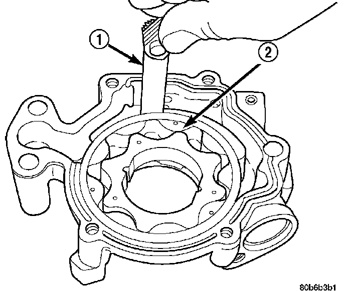 3. Slide outer rotor into the body of the oil pump. Press the outer rotor to one side of the oil pump body and measure clearance between the outer rotor (2) and the body. If the measurement is 0.235 mm (0.009 inch) or morethe oil pump assembly must be replaced.