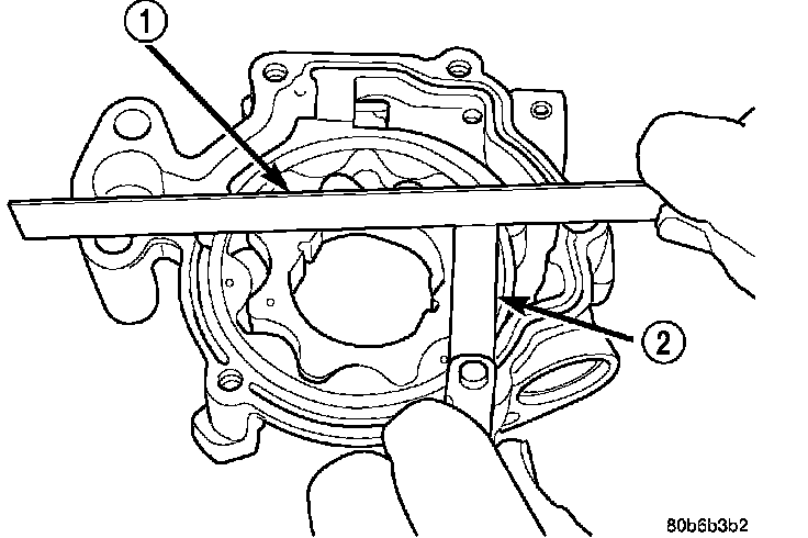 5. Place a straight edge (1) across the body of the oil pump (between the bolt holes), if a feeler gauge (2) of 0.095 mm (0.0038 inch) or greater can be inserted between the straightedge and the rotors, the pump must be replaced.