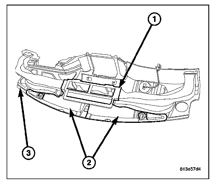 NOTE: LHD model shown in illustration. RHD model similar.The two slot - type defroster outlets located near the center of the instrument panel receive airflow from the HVAC housing through the molded plastic main distribution duct (1) and defroster ducts (2), which are attached to the bottom of the instrument panel top cover (3).