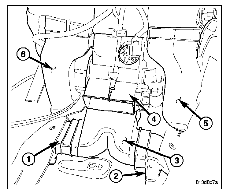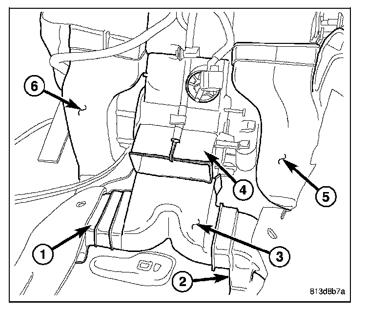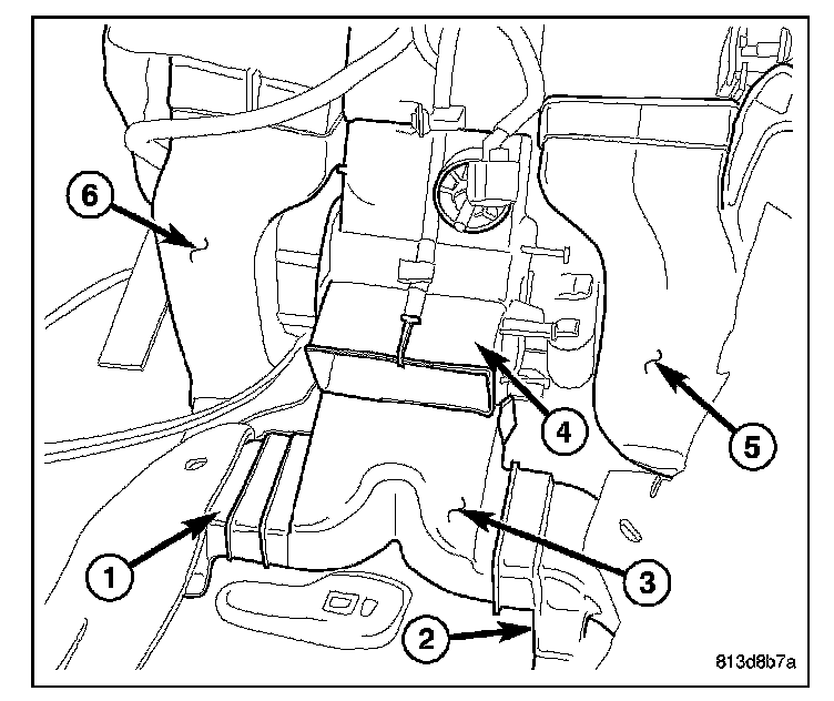 2. Disconnect the right front floor duct (5) and the left front floor duct (6) from the rear of the air distribution housing (4) and remove the front floor ducts from the vehicle.