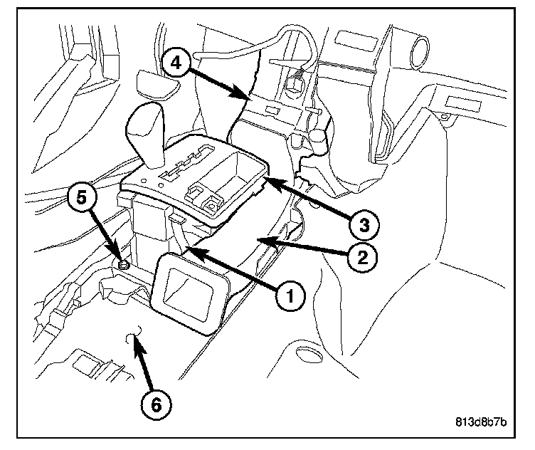 5. Remove the screws (5) that secure the gear selector to the floor panel (6) and position the gear selector out of the way.