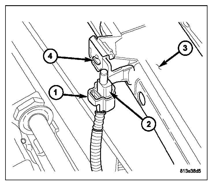 1. Install the ambient air temperature sensor (2) onto the top of the front bumper beam (3). Make sure that the retaining tabs (4) are fully engaged.