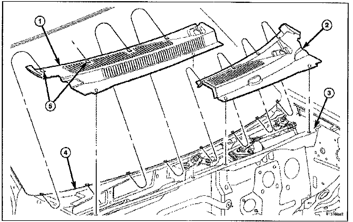 3. Install tabs under windshield (4) and rubber seal on top of windshield and push the cowl panel rearward to engage clips fully.