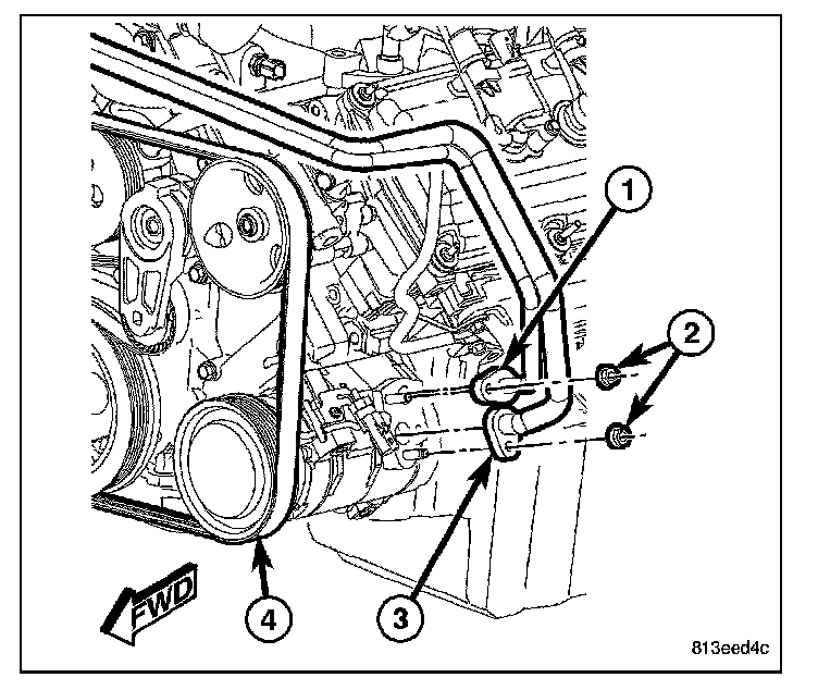2. Install the bolts (4) that secure the A/C compressor to the engine. Tighten the bolts to 55 N.m (41 ft. lbs.).