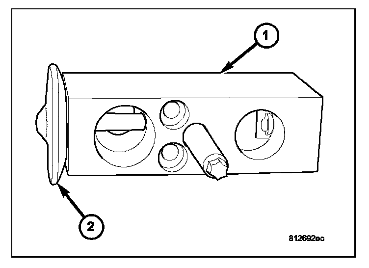 The A/C expansion valve controls the amount of refrigerant entering the A/C evaporator and is of a thermo - static expansion valve (TXV) design. The A/C expansion valve consists of an aluminum H - valve type body (1) with an integral thermal sensor (2) and is located at the dash panel between the A/C refrigerant lines and the A/C evaporator.