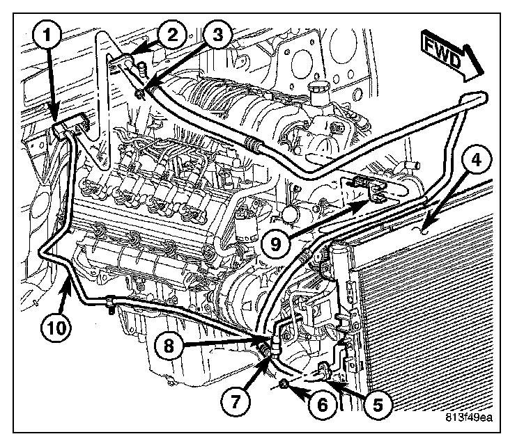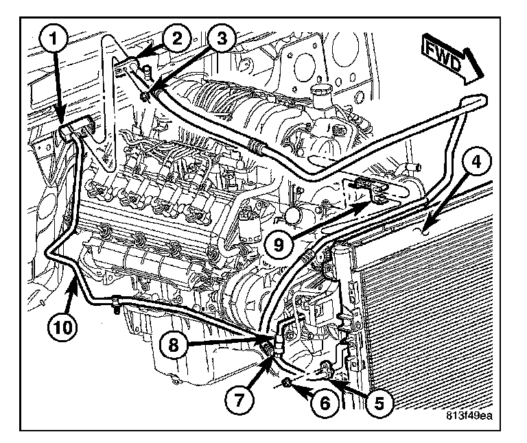 7. Disconnect the A/C discharge line from the A/C condenser and the retaining bracket (9) and remove and discard the dual plane seal.