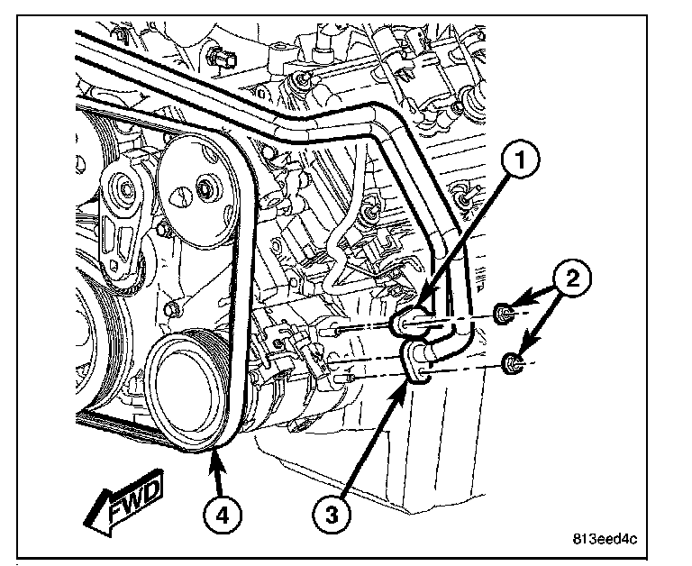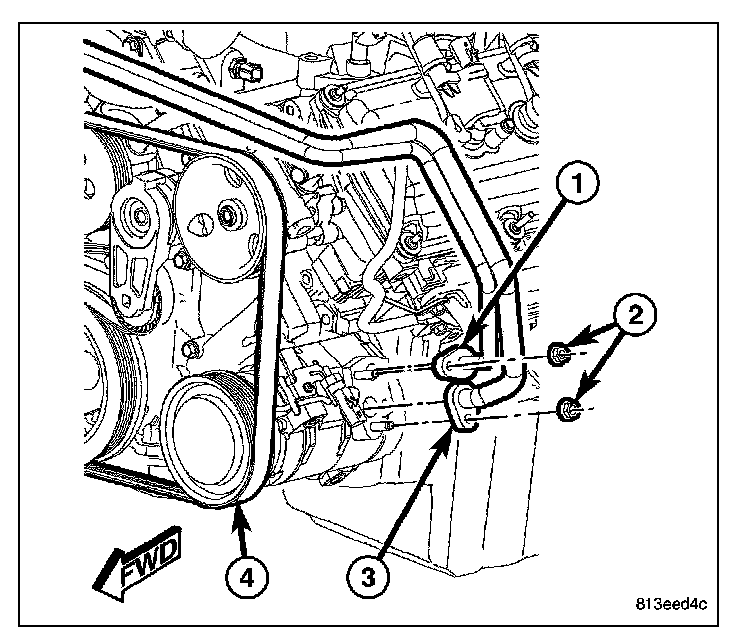 8. Remove the nut (2) that secures the A/C discharge line (1) to the A/C compressor (4).