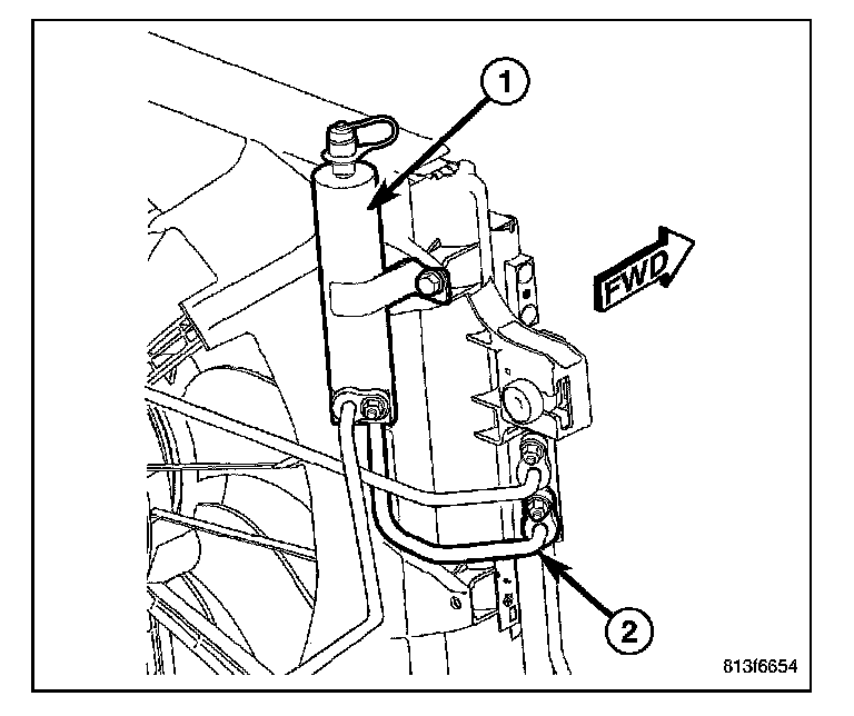 The receiver/drier (1) stores unnecessary refrigerant, filters the refrigerant, helps remove moisture from the refrigerant and retains any refrigerant vapor that may leave the A/C condenser (2) until it becomes a liquid. The receiver/drier is installed on the high - side of the A/C system and is connected directly to the right end of the A/C condenser. The receiver/drier can be easily serviced by removing the grille and air cleaner housing.