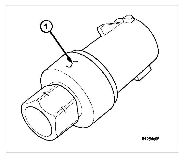 The A/C pressure transducer (1) is a switch that is installed on a fitting located on the A/C discharge line. An internally threaded fitting on the A/C pressure transducer connect it to the externally threaded Schrader - type fitting on the A/C discharge line. A rubber O-ring seals the connection between the A/C pressure transducer and the discharge line fitting. The A/C pressure transducer is connected to the vehicle electrical system by a molded plastic connector with three terminals.
