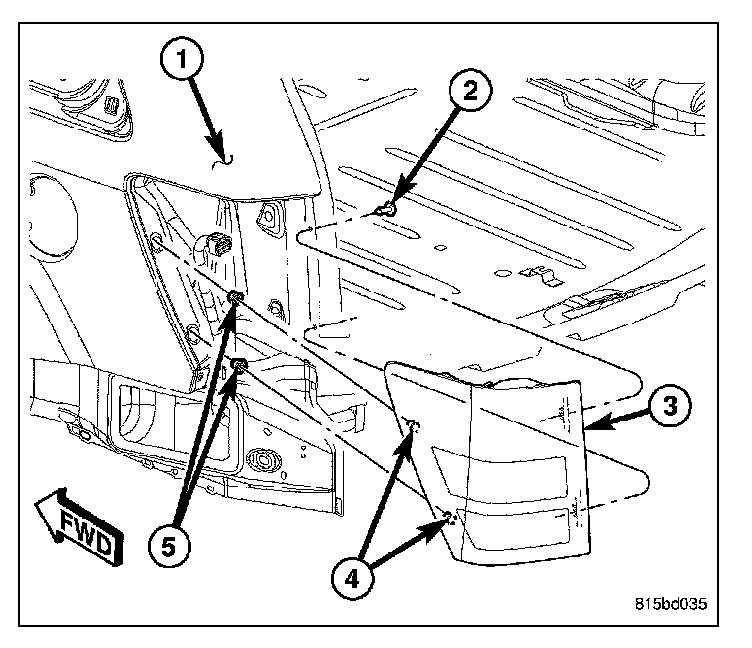 5. Align the two ball studs (4) on the outboard side of the lamp housing (3) with the two grommets in the quarter outer panel.