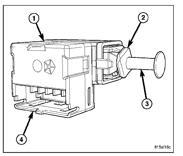 The brake lamp switch (1) is a three circuit, spring loaded plunger actuated switch that is secured to the brake pedal support bracket under the instrument panel on the driver side of the vehicle. The molded plastic switch housing has an integral connector receptacle (4) containing six terminal pins. The switch is connected to the vehicle electrical system through a dedicated take out of the headlamp and dash wire harness.