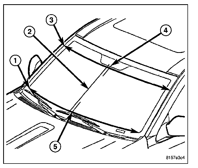 1. Take a measurement (3) across the lower edge of the tint band at the top of the windshield using the shaft of the tint band arrow within the "AS1" marking on each side of the glass as the reference points.