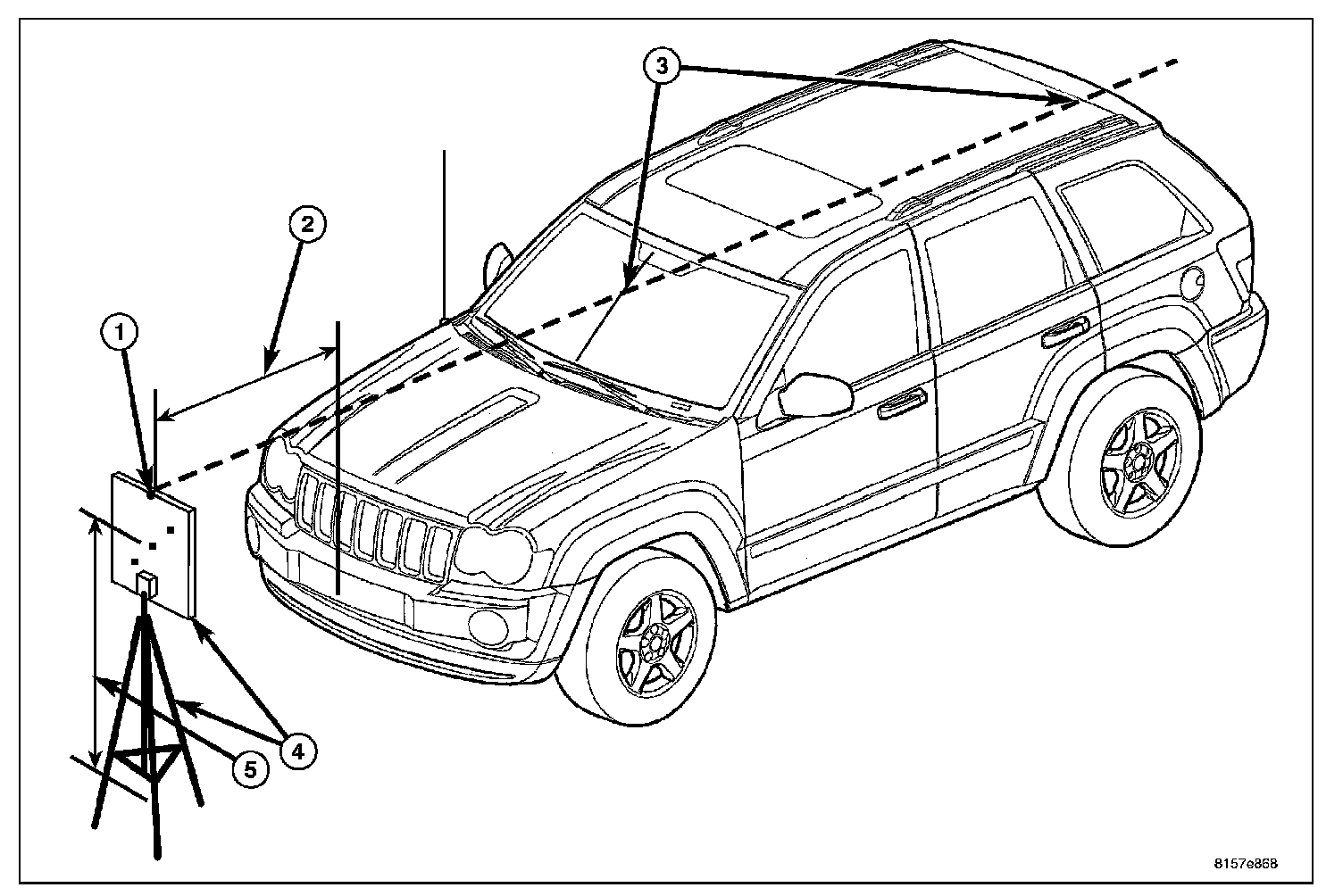 2. Place the aim board and tripod (4) (Special Tool #9649) 127 centimeters (50 inches) ahead of the foremost center of the front fascia (2).