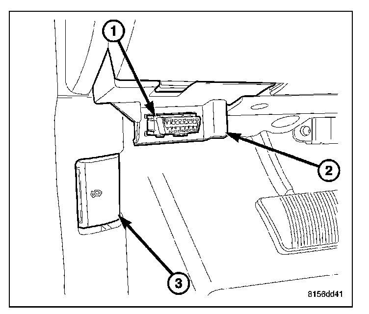 1. Connect a diagnostic scan tool to the Data Link Connector (DLC) (1) below the driver side end of the instrument panel (2).