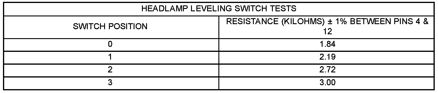 3. Using an ohmmeter, perform the resistance tests at the terminal pins in the switch pod connector receptacle as shown in the Headlamp Leveling Switch Tests table.