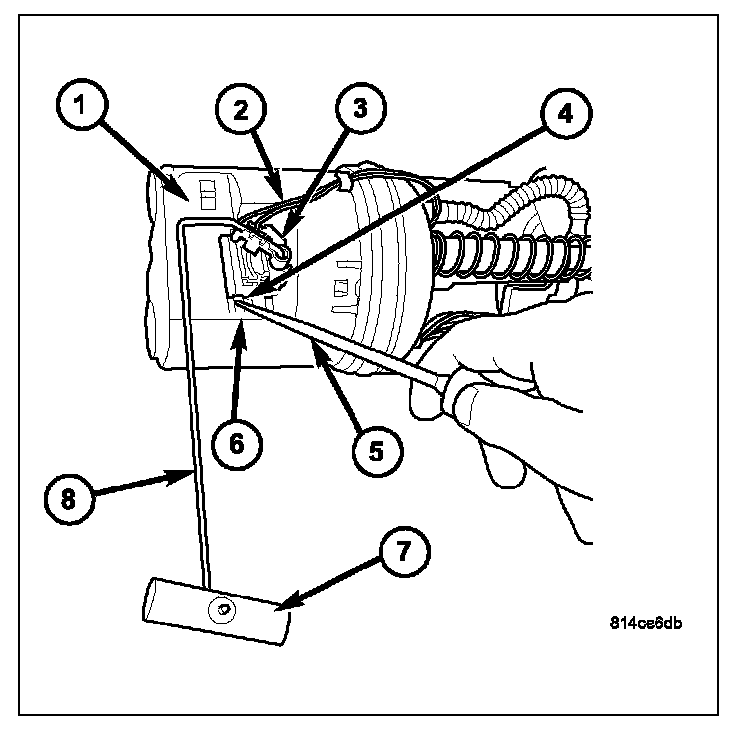 The fuel level sending unit (fuel level sensor) (3) and float assembly (7) and (8) is located on the side of the fuel pump module.