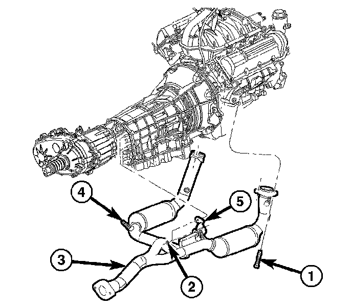 2. Position the front exhaust pipe/catalytic converter assembly (4) into vehicle.