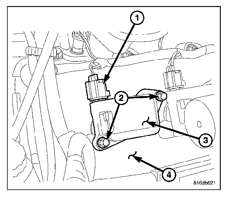 The 5.7L V-8 engine uses 8 dedicated and individually fired coils (3) for each pair of spark plugs. Each coil (3) is mounted directly to the top of each spark plug. Each coil is bolted (2) to the valve cover (4).