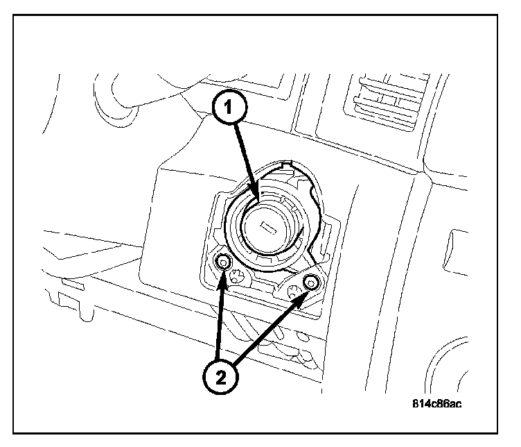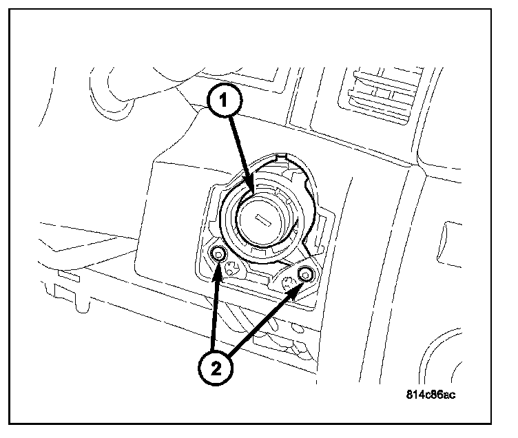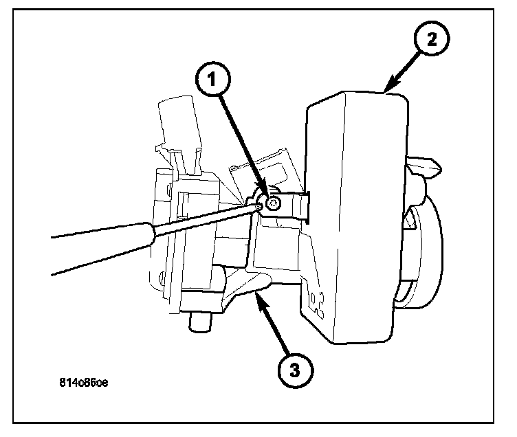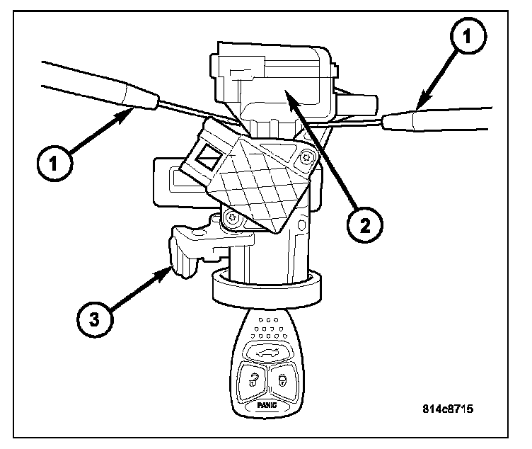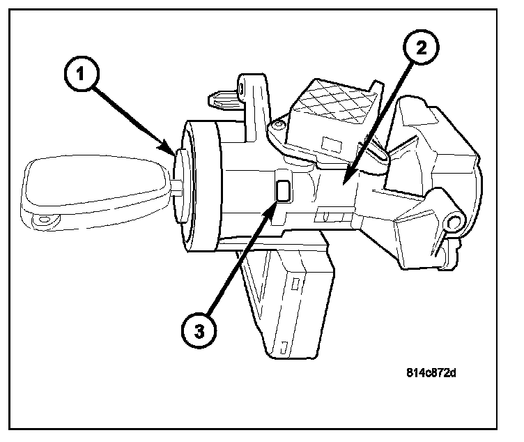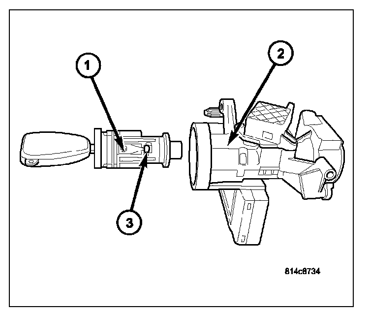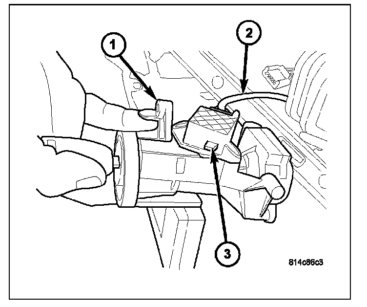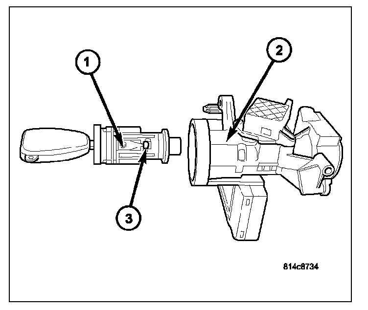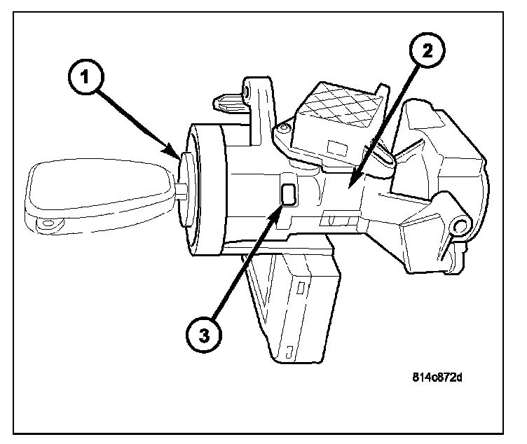 12. To remove key lock cylinder (1) from housing (2), rotate key to ON position while pressing on release tab (3).