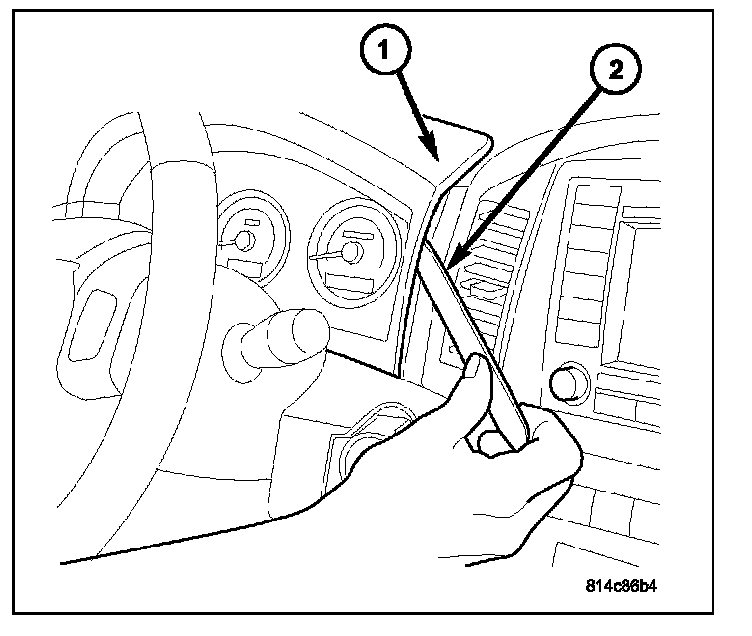 6. Use a plastic trim removal stick (2) to remove I.P. cluster bezel (1). Bezel snaps on.