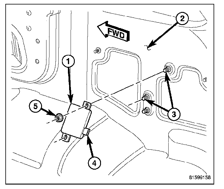 4. Remove the two nuts (5) that secure the module to the studs (3) on the quarter inner panel.