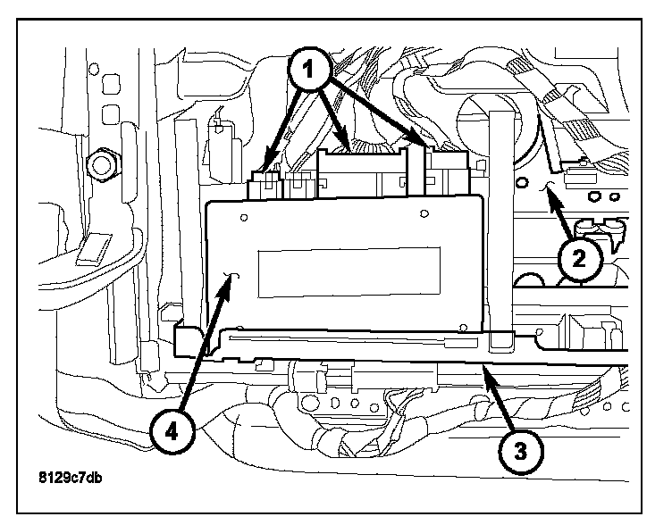 1. Place the module (4) into position making sure the mounting tabs are properly aligned with the front bracket.