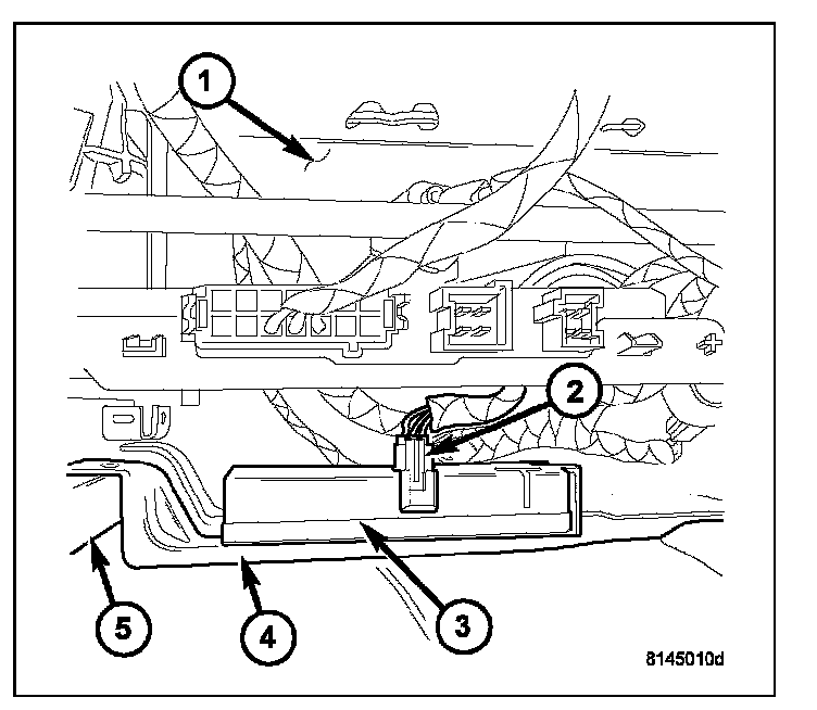 The heated seat module (3) is located under the right front seat (1). It has a single electrical connector (2) and four locking tabs that secure it to the mounting bracket (4). The module can be accessed from under the front right seat with the seat in the full back position. The mounting bracket (4) is bolted to the seat frame assembly (5)