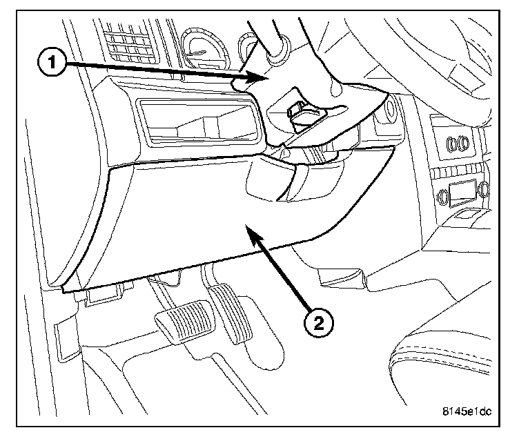 The molded plastic JB housing is secured with four screws and two snap retainers to the JB mounting bracket behind the instrument panel steering column opening cover (3). The steering column opening cover can be pulled downward to disengage the latches and provide service access to all of the fuses, relays and wire harness connectors (1) of the JB. Refer to Steering Column Opening Cover in Body.