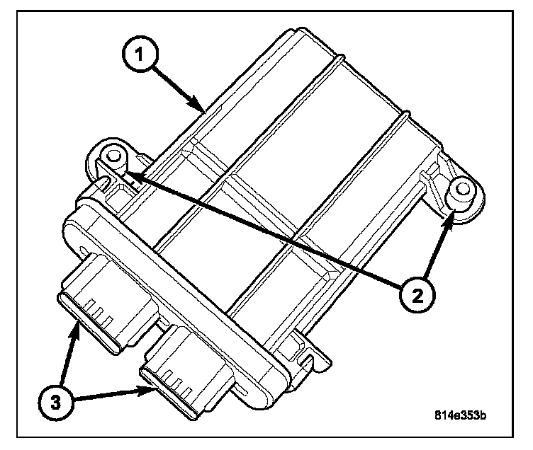Two mounting tabs (2) and two connector receptacles (3) are integral to the OCM housing. The connector receptacles contain terminal pins that connect the OCM to the vehicle electrical system through a dedicated take out and connector of the passenger side front seat wire harness, and a second take out and connector of the body wire harness.