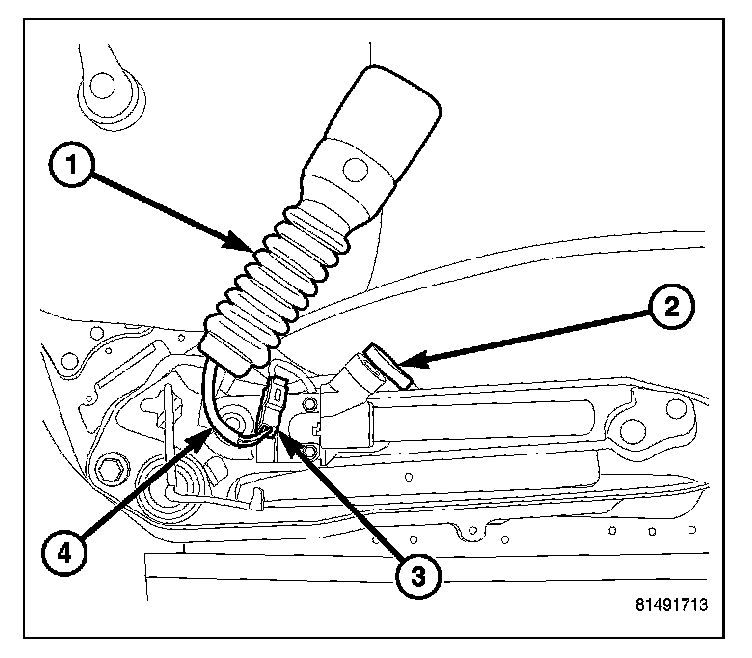 7. Remove the nut (4) that secures the front seat belt buckle (1) lower anchor to the stud on the inboard side of the seat cushion frame.