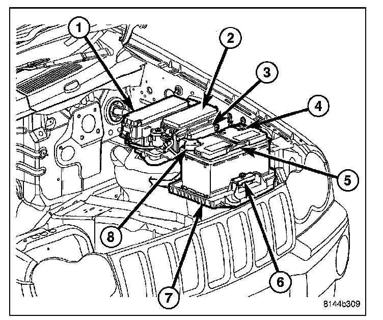 The battery cables (4) and (8) are large gauge, stranded copper wires sheathed within a heavy plastic or synthetic rubber insulating jacket. The wire used in the battery cables combines excellent flexibility and reliability with high electrical current carrying capacity. The battery cables feature a stamped brass clamping type female battery terminal crimped onto one end of the battery cable wire and then solder-dipped. A square headed pinch-bolt and hex nut are installed at the open end of the female battery terminal clamp. Large eyelet type terminals are crimped onto the opposite end of the battery cable wire and then solder- dipped. The battery positive cable wires (8) have a red insulating jacket to provide visual identification and feature a larger female battery terminal clamp to allow connection to the larger battery positive terminal post. The battery negative cable wires (4) have a black insulating jacket and a smaller female battery terminal clamp.