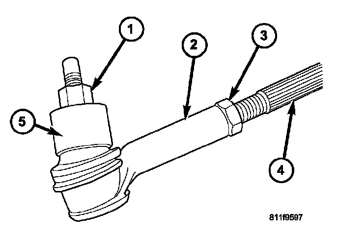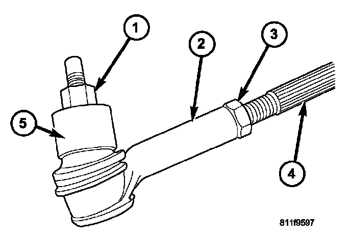 6. Install the outer tie rod ends (2) to the knuckle (5) and tighten the tie rod end nut (1) to 95 Nm (70 ft. lbs.).