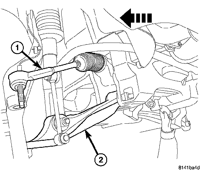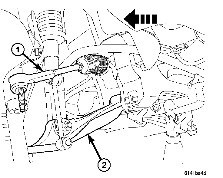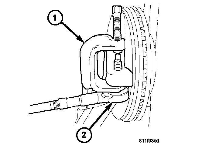 10. Remove the outer tie rod end nut and separate the tie rod (2) from the knuckle using special tool #8677 puller (1).