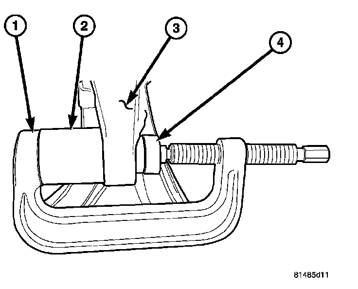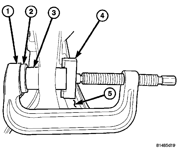 1. Install the new clevis bracket bushing (3) into the lower control arm (5) using tools C-4212-F (Press) (1), 9653-3 (driver) (2), 9653-4 (Depth gauge) (4) the depth gauge will automatically set the depth of the bushing (3) in the control arm (5).