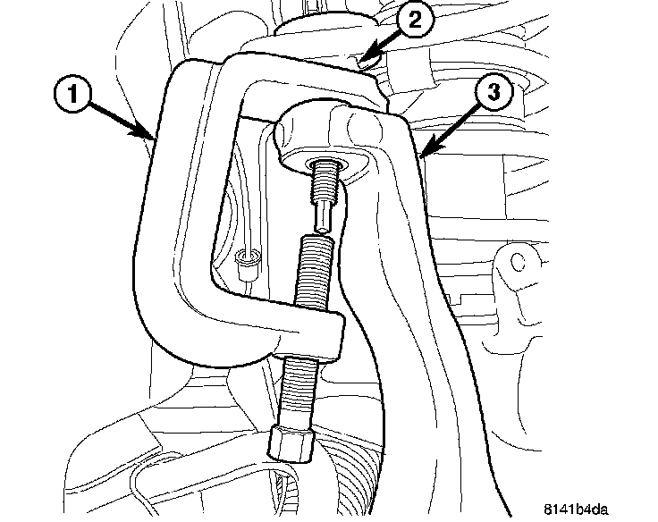 5. Separate the upper ball joint (2) from the knuckle (3) using special tool #8677 (1).