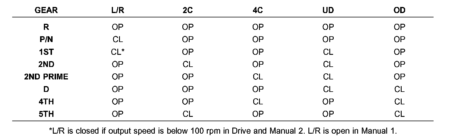 The TCM relies on five pressure switches to monitor fluid pressure in the L/R, 2C, 4C, UD, and OD hydraulic circuits. The primary purpose of these switches is to help the TCM detect when clutch circuit hydraulic failures occur. The switches close at approximately 23 psi and open at approximately 11 psi, and simply indicate whether or not pressure exists. The switches are continuously monitored by the TCM for the correct states (open or closed) in each gear as shown in the following chart: