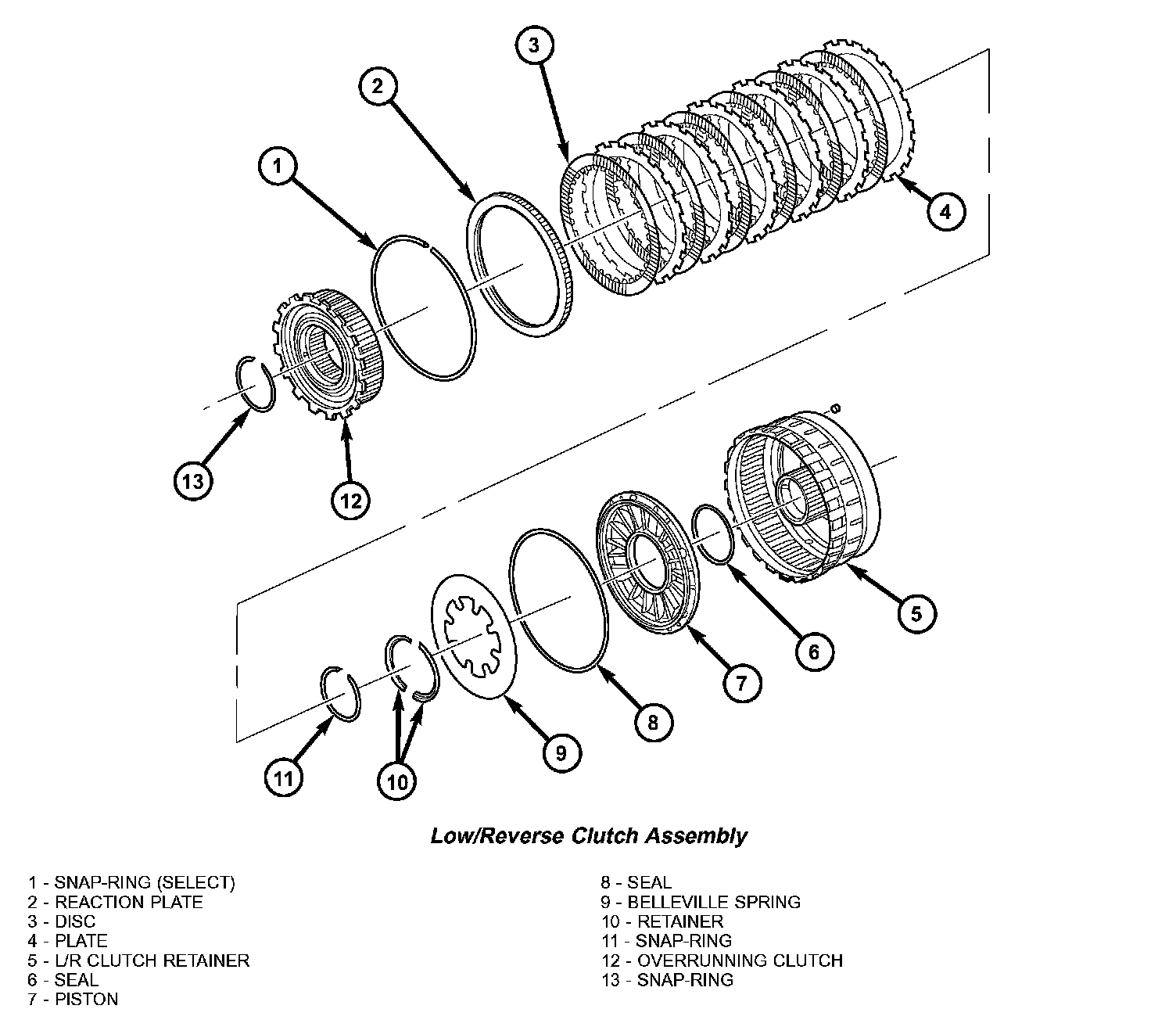 1. Remove the inner overrunning clutch snap-ring (13) from the low/reverse clutch retainer (5).