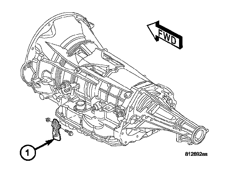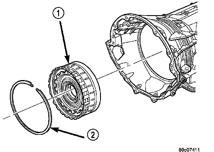 34. Install the 4C retainer/bulkhead tapered snap-ring (1) into the transmission case with the taper toward the front of the case. Make sure that the open ends of the snap-ring are located in the case opening toward the valve body area.