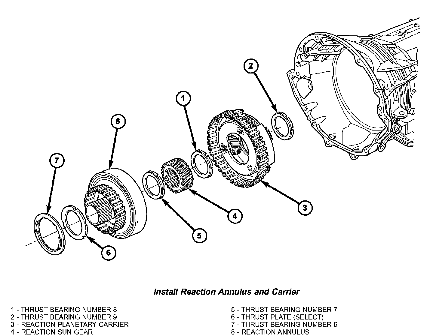 26. Install the reaction planetary gear set and the number 9 thrust bearing (2), with the inner race against the reaction planetary carrier (3), into the transmission case.