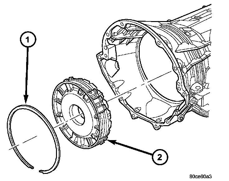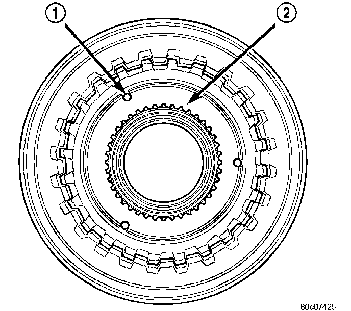 33. Install the 4C retainer/bulkhead (2) into the transmission case. Make sure that the oil feed holes are pointing toward the valve body area. Rotate the reaction annulus during the installation of the 4C retainer/bulkhead to ease installation.