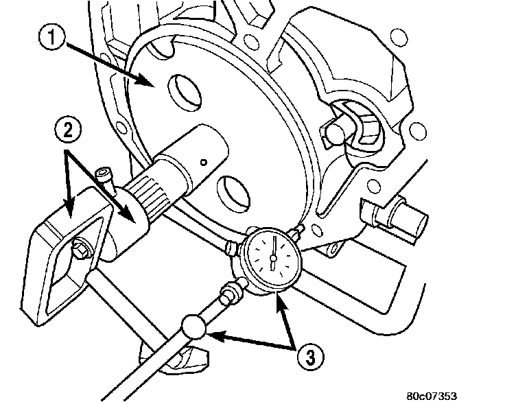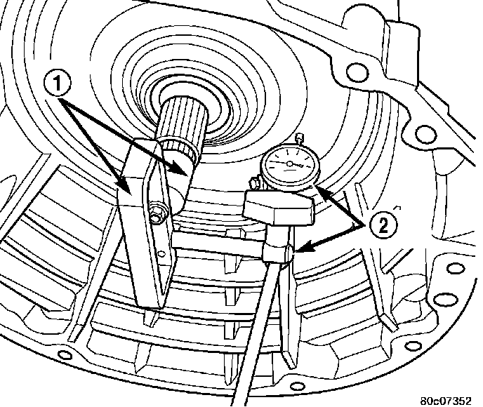 44. Using Adapter 8266-1 from End-Play Tool Set 8266 (1) and Dial Indicator C-3339 (2), measure and record the input shaft end-play. The correct end-play is 0.46-0.89 mm (0.018-0.035 inch). Adjust as necessary Install the chosen thrust plate on the number 5 thrust bearing and re-measure endplay to verify selection.