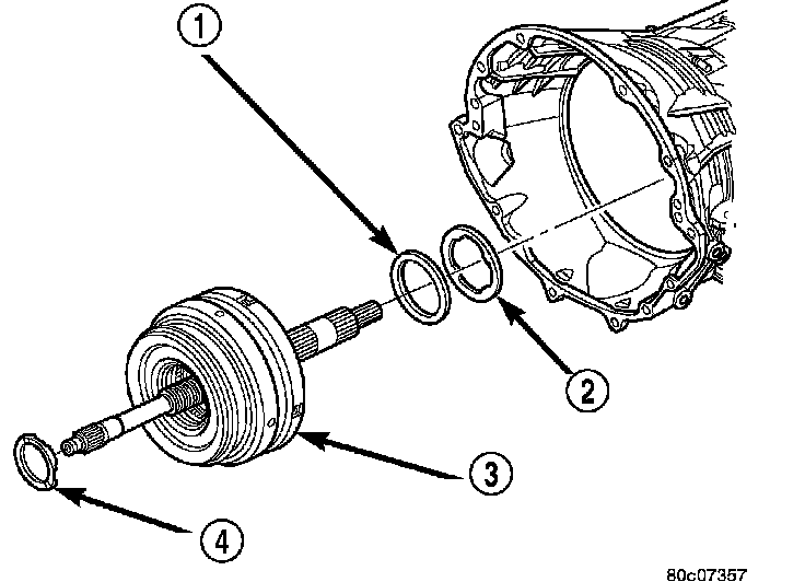 12. Install the 4C retainer/bulkhead (2) into the transmission case. Make sure that the oil feed holes are pointing toward the valve body area.